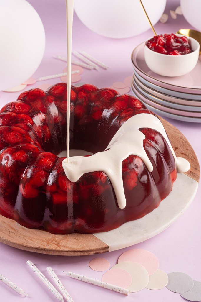 Deliciosa gelatina de cereza bañada con salsa de crema. ¡Te sorprenderá su sabor!