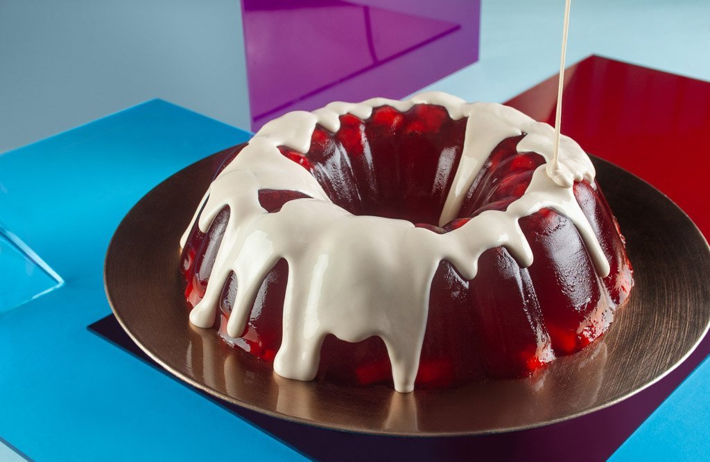 Deliciosa gelatina de cereza bañada con salsa de crema. ¡Te sorprenderá su sabor!
